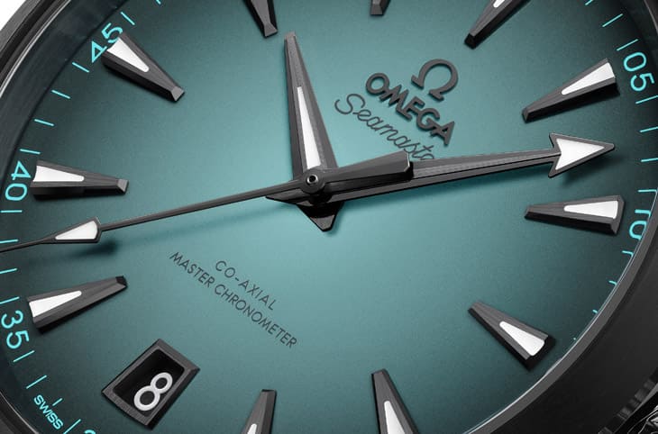 マットターコイズブルー中央部分は外側に向かってブラックへとフェードアウトし、そフラットな質感がダークグレーPVDアワーマーカーと針とコントラストを成しています。夜光塗料が塗布されているため、暗い場所でも高い視認性を確保し、湖水と太陽光が織りなすようなダイナミックな色彩遊びを生み出します。38mmと41mm2サイズ展開で展開されるこ新作モデルは、様々な手首やスタイルにマッチします。ケースは、Shadesラインポリッシュ仕上げを踏襲し、クラシックなハープ型ラグ、円錐形ねじ込み式リューズ、波模様エッジが施されたケースバックを備えています。150m防水機能を備え、アクアテラ伝統的な実用性も備えています。サファイアクリスタルケースバックからは、オメガを象徴するムーブメント仕上げを鑑賞できます。